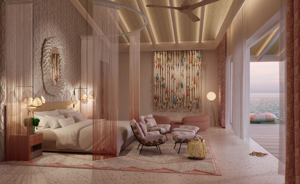 Die Wasservillen sind verteilt auf zwei Inseln, jeweils mit 45 m langem, schwebendem Infinity-Pool und mit Strand- bzw. Wasserzugang, sehr modern und fast schon futuristisch, farbenfroh eingerichtet.