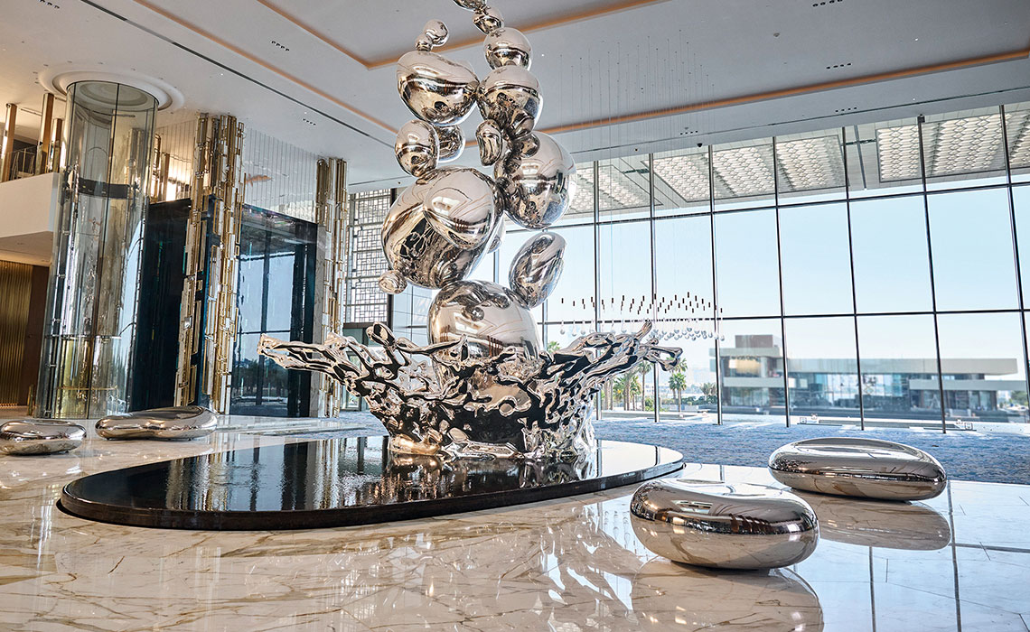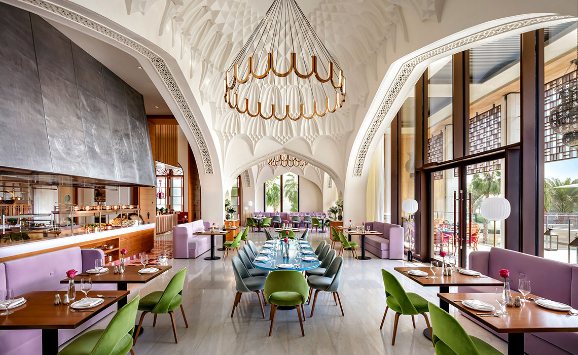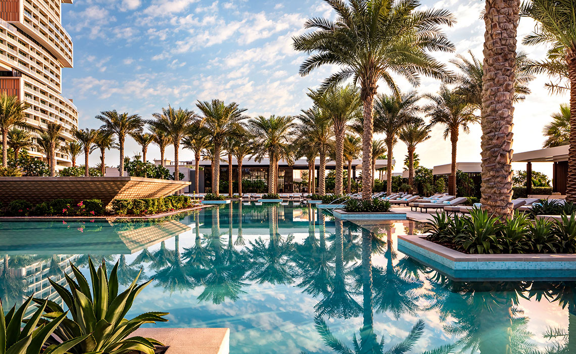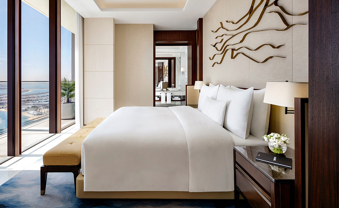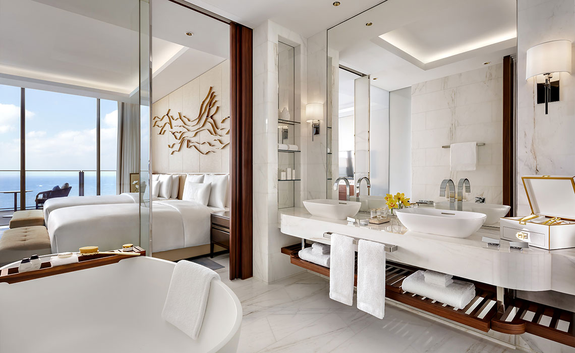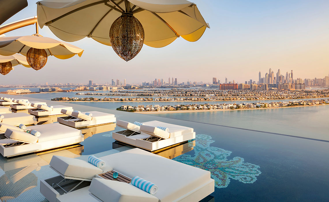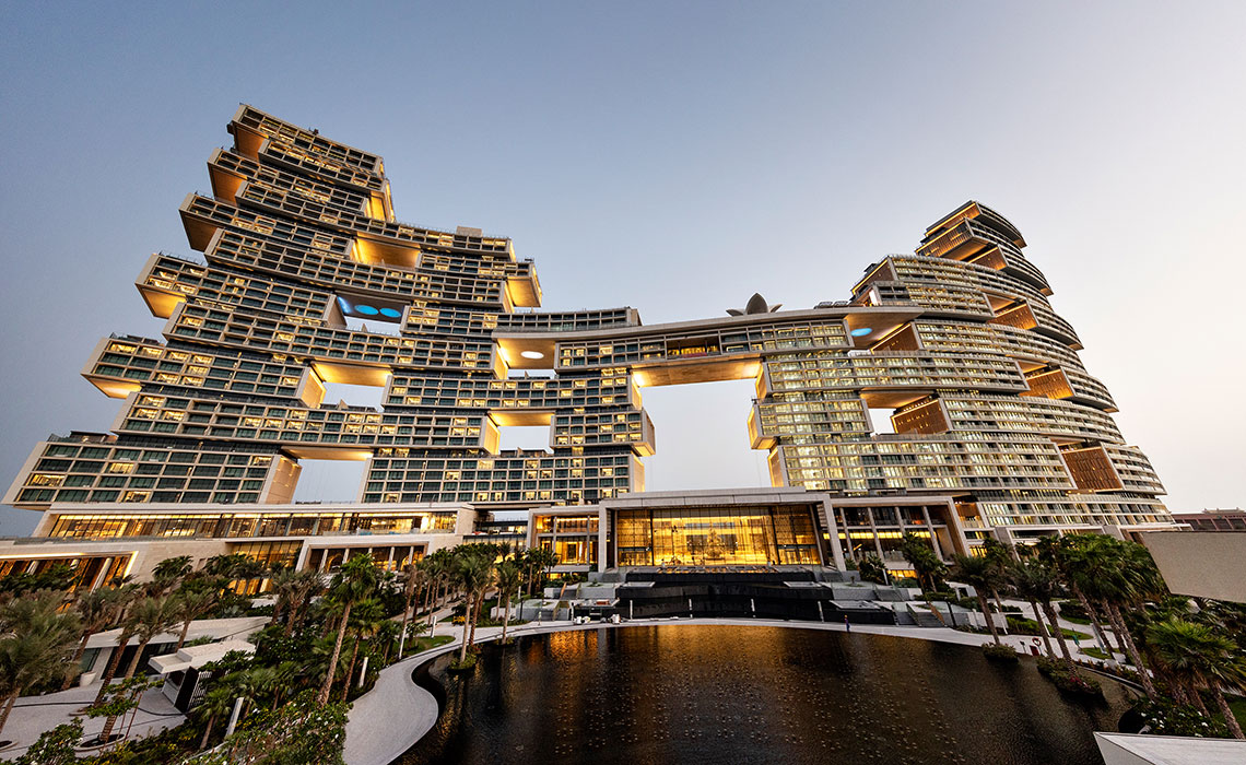 Dubai ist immer für einen Wow-Effekt gut, vor allem, wenn es um bahnbrechende, alle bislang existierenden Superlative toppende Architektur geht. Das Ultra-Luxus-Resort Atlantis The Royal ist der „place to be“. Es steht gleich neben seinem Schwesterhotel Atlantis The Palm auf einem sichelförmigen Wedel der künstlich angelegten Insel von Palm Jumeirah und gilt als Meisterwerk des New Yorker Architekturbüros Kohn Pedersen Fox Associates: massiv und doch filigran, zum Meer hin geschwungen, mit spielerisch übereinander gestapelten Wohnblöcken und himmelblauen Fenstern, die dem mächtigen Bauwerk Leichtigkeit verleihen. Das Interieur wirkt trotz des großzügigen Einsatzes von Gold und Marmor elegant und zurückhaltend. Die Zimmer, Suiten und Penthouses, teilweise mit spektakulären Infinity-Pools, sind modern, urban und luftig mit hellem Designermobiliar, Schiebetüren aus dunklem Holz und einem wohldosierten Hauch von Gold – etwa in Form von goldenen Zahnbürsten im großzügig bemessenen Bad. Ein absolutes Highlight ist der angesagteste Rooftop-Poolclub der Stadt mit fantastischem Rundum-Panoramablick über Dubai. Natürlich ist auch die Gastronomie eine Klasse für sich: Es gibt elf Restaurants, darunter Lokale von Celebrity-Chefs wie Nobu Matsuhisa, Heston Blumenthal oder Gastón Acurio. Dazu: diverse Lounges und Bars, ein spektakuläres Spa, mehrere Pools und ein 2 km langer Privatstrand vor der Tür.