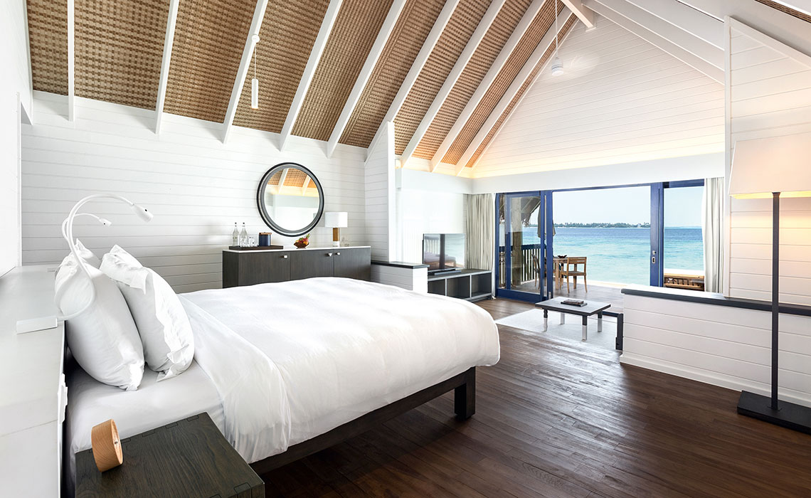 Dhoni-Villa: geschmackvoll eingerichtet in hellen naturverbundenen Farben mit TV, Bose-Lautsprecher-System, Minibar, Safe, Sitzecke und schöner Außenterrasse.