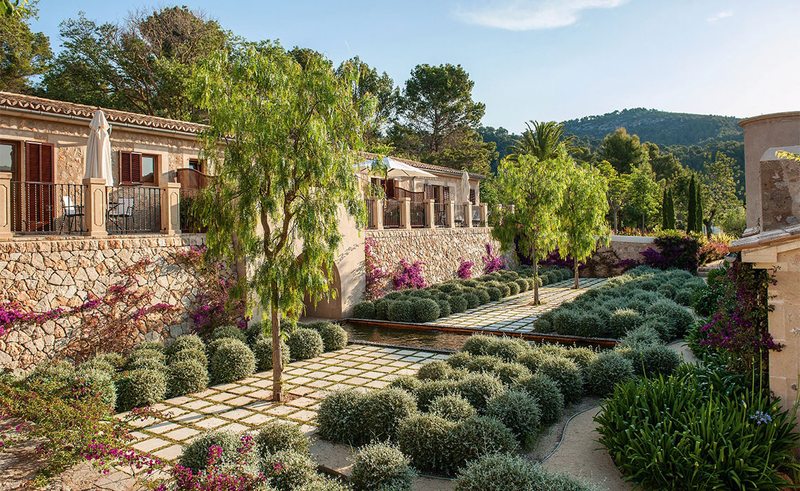 Schon wenn der Gast in die Einfahrt zum Castell Son Claret abbiegt, in der hohe Palmen in einem Meer von roten Rosen Spalier stehen, kommt man sich fast wie in einem Märchen vor. Das historische Gebäude liegt in der Nähe von Calvia und ist ein altes Schloss aus dem 19. Jahrhundert mit Ställen und Wasserturm, das äußerst geschmackvoll restauriert und zum Hotel umgebaut wurde. Hinter den dicken Schlossmauern und in den Nebengebäuden befinden sich 20 exklusive Zimmer und 23 Suiten, einige mit Balkon, Terrasse oder privatem Garten mit Pool. Die alte Kapelle ist in eine mit moderner Kunst geschmückte Bar umfunktioniert und ein paar Stufen tiefer im Schlosskeller befindet sich das schöne Spa mit Sauna und Hamam, Behandlungsräumen und Pool sowie einer erwähnenswerten tropischen Naturwand. Zwei Restaurants servieren das Beste aus der mediterranen Küche mit ganz frischen Zutaten aus dem Garten und aus der eigenen Bäckerei. Ob auf der tollen Terrasse oder in dem gemütlichen Gewölbe gespeist wird, entscheidet der Gast (oder das Wetter)! Das 132 ha große Anwesen ist wunderschön mit verschlungenen Wegen und Pfaden angelegt, gesäumt von Orangen- und Feigenbäumen, einem duftenden Rosengarten und lauschigen Plätzen am Wasser. Am Pool zu liegen mit fantastischem Blick auf die sanfte Hügellandschaft und die Berge im Hintergrund und dabei still vor sich hinzuträumen, ist einfach wahrer Luxus! So lautet auch das Hotelmotto: The Luxury of Being Yourself.