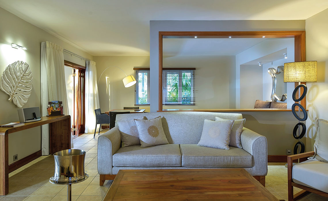 172 Zimmer. Ausschließlich Suiten, alle zur Meerseite, sehr geräumig und geschmackvoll eingerichtet, mit großem Bad (Badewanne mit Blick auf den "Le Morne"), Ankleidebereich, Sitzecke, Minibar, Safe, Telefon, TV, riesiger Terrasse oder Balkon. Villen direkt am Strand mit eigenem Pool.