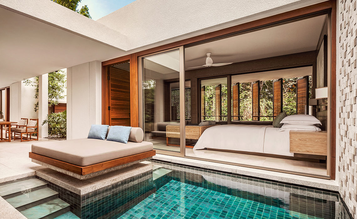 44 Suiten. Die luxuriösen Junior-Suiten mit Blick auf das Meer oder den Regenwald punkten durch stilvolles, modernes Design, das durch malaysische Details abgerundet wird. Alle sehr geräumig mit privatem Pool und Veranda, Minibar, TV, Safe, Klimaanlage, Tee- und Kaffeezubereitungsmöglichkeit.