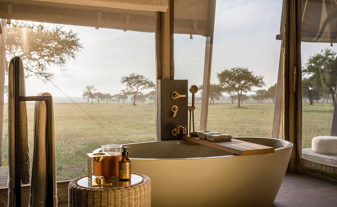 Authentisches Feldmobiliar aus den 1920er-Jahren, Kronleuchter, Kristallglas, persische Teppiche und Vasen mit frischen Rosen – das alles in der Serengeti, also im tiefsten afrikanischen Busch? Das Sabora Tented Camp macht es möglich und liefert gleich auch noch den makellosen Service eines perfekt geführten Hotelbetriebs dazu. Die neun Luxuszelte sind mit Lesebereich, Ankleidezimmer, Bad mit Badewanne und Außendusche sowie einer Aussichtsplattform mit Fernrohr versehen. Im Hauptcamp stehen zudem ein eleganter Essbereich, eine Lounge mit Bar, eine Bibliothek und ein Pool zur Verfügung. Fast noch schöner ist es außerhalb des Camps: Weite Ebenen mit schirmförmigen Akazien unter ewig blauem Himmel und ein lebhaftes Wildtierleben machen jede Ausfahrt im offenen Jeep zu einem absoluten Hochgenuss.