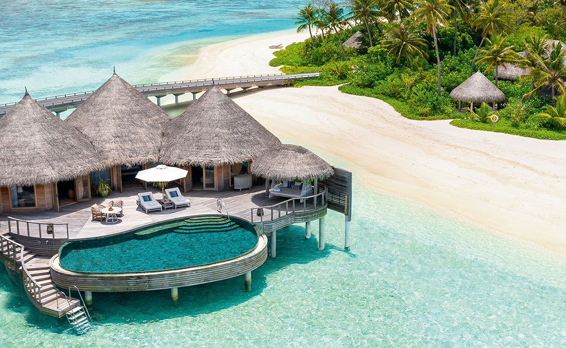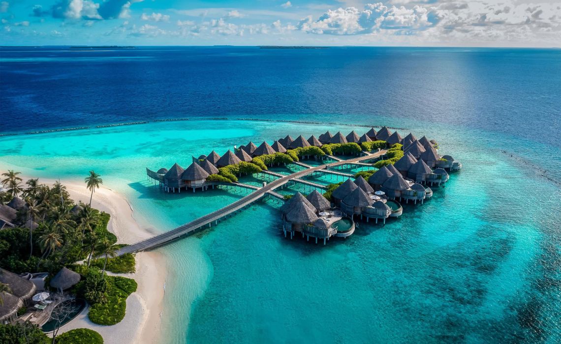Es gibt 1.200 Malediven-Inseln, die meisten davon sind unberührt. Nur knapp 200 sind bewohnt, entweder von der einheimischen Bevölkerung oder von Urlaubsgästen, die hier ihren Südseetraum ausleben, obwohl sie nicht in der Südsee sind. Die ist viel weiter weg, aber optisch vergleichbar: Beim Anflug aus der Luft wirkt es, als habe Frau Holle ihr Kissen geschüttelt, nur dass anstelle von Federn Inseln in die Tiefe fielen. Dort schwimmen sie nun im türkisblauen Indischen Ozean. Ihr Kern ist dschungelgrün, ihre Ränder sind sandweiß und an langen Stegen, die wie schlanke Insektenbeine über das Wasser führen, reihen sich Häuschen, die sich aus der Nähe betrachtet als meist luxuriöse, großzügige Gäste-Bungalows entpuppen. In der Regel gilt: eine Insel, ein Hotel. In vielen davon wird Privacy zelebriert, in anderen auch öfter gefeiert. Breit gefächerte Wassersportmöglichkeiten, schöne Spas und diverse Restaurants bieten Abwechslung – doch eigentlich braucht man sie nicht. Die Aussicht von der eigenen Terrasse auf das Meer und die Privatleiter ins Wasser reichen, um wunschlos glücklich zu sein. So kommen Freunde ungestörter Einsamkeit ebenso auf ihre Kosten wie all jene, die Unterhaltung, Sport, Gourmet-Dining und Luxus suchen.